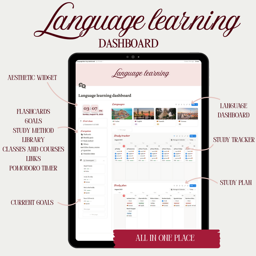 You'll get the Language Learning Dashboard – an all-in-one Notion space to organize, track, and optimize your language learning journey!