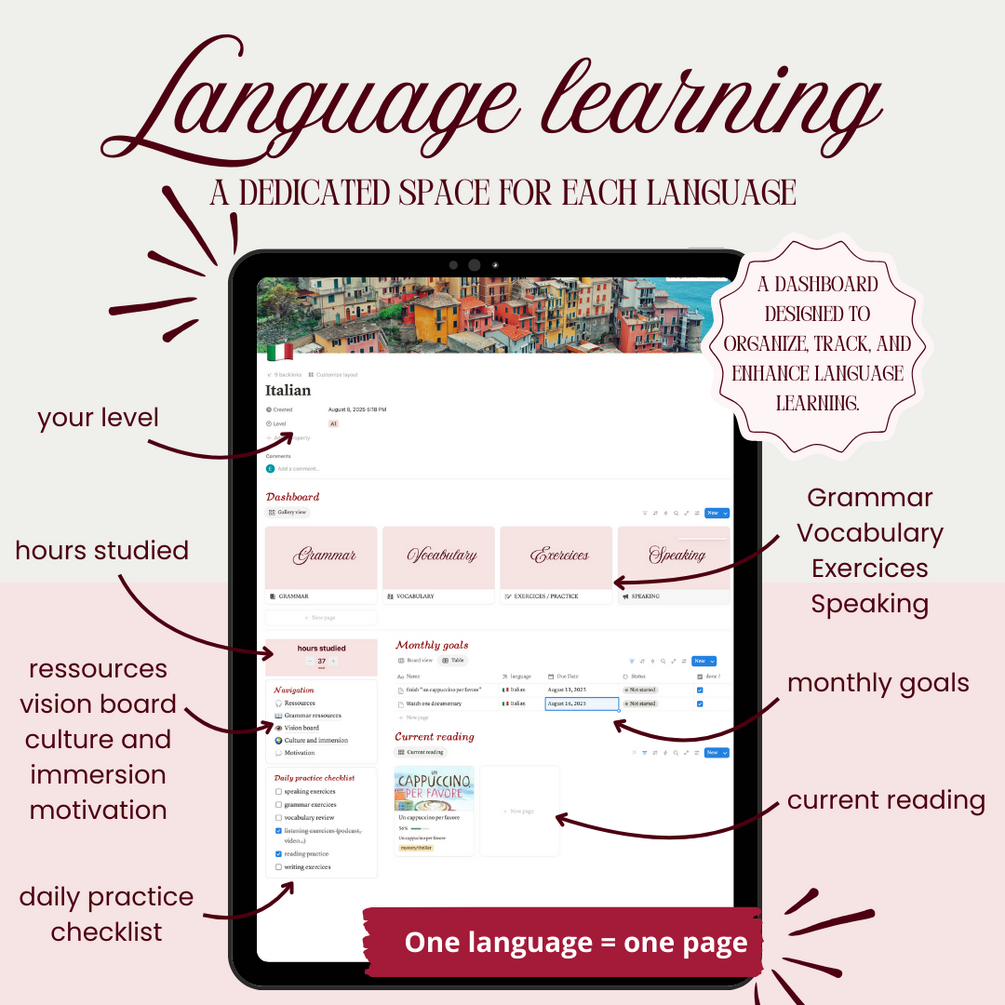 You'll get the Language Learning Dashboard – an all-in-one Notion space to organize, track, and optimize your language learning journey!